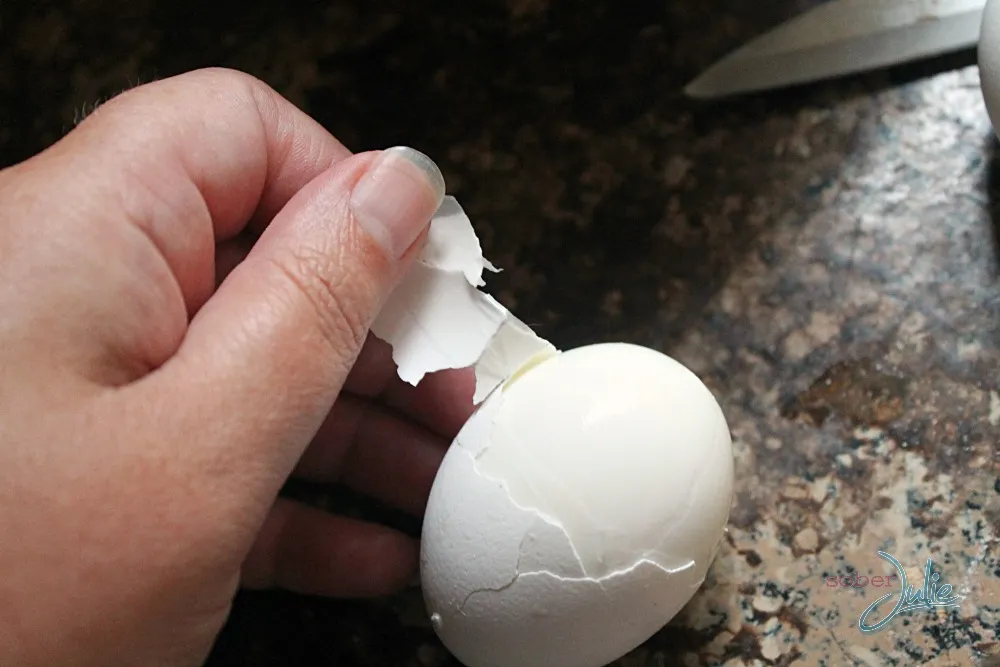 f. Tenderly tap each egg on a hard surface to break the shell, then, at that point, strip off the shell under cool running water.